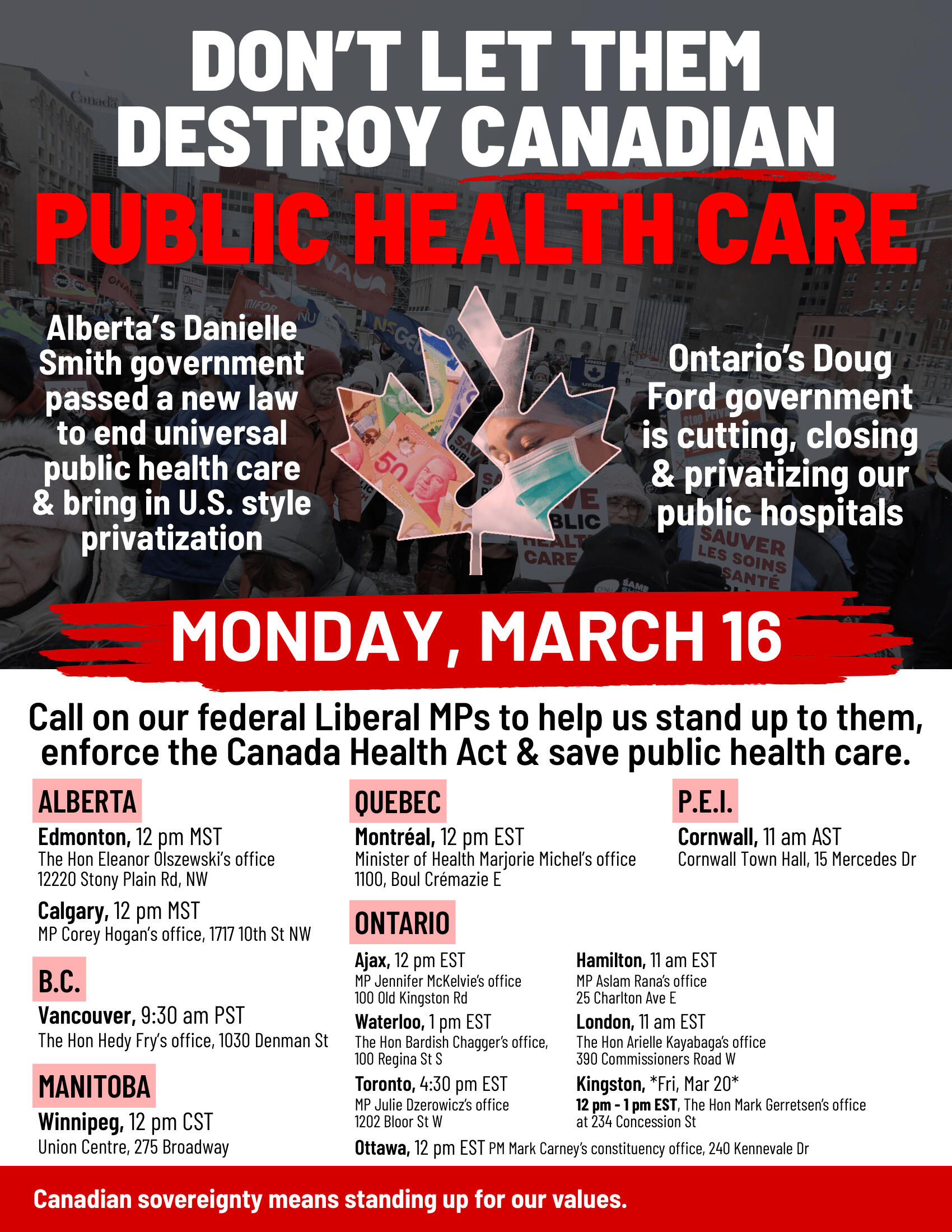 Sign up to participate in the Day of Action for Public Health Care on March 16. We will send you the tools and information you need to send a message directly to your MP and Health Minister Marjorie Michel, as well as information about in-person demonstrations happening in your province.
